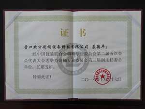 營口北方制桶設備科技有限公司為鋼桶專業委員會第三屆副主任委員單位,任期